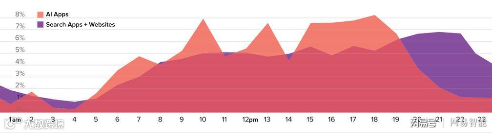 我们将个人语音助理应用程序的“一天”与典型的搜索应用程序或网络浏览器进行了比较(注:用户在个人助理应用上花费的时间比搜索应用和网页浏览器少得多;下面的图表显示了每个类别的总时间百分比)。