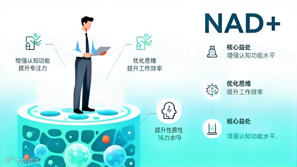 职场人群反馈:在一项针对 300 名久坐职场男性的干预实验中,补充 NAD + 的受试者,同等工作强度下的疲劳感出现时间延迟 30% 以上,下午时段的专注力评分提升 20%,且运动后肌肉恢复时间缩短 18%。