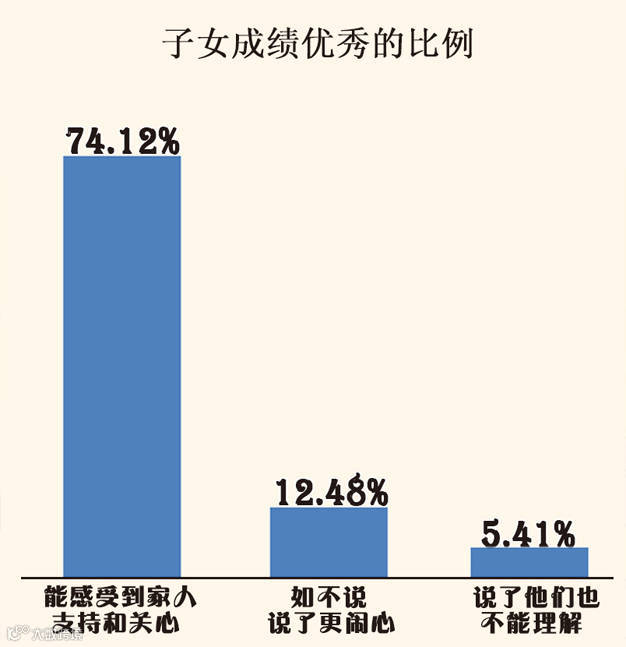 圝圝家人间的情绪理解与反馈不容忽视。调查显示,家庭成员间对情绪的理解和反馈越好的家庭,其子女成绩优秀的比例越高。 圝圝如当父母情绪不好时,“能感受到家人支持和关心”的家庭,其子女成绩优秀的比例最高,为74.12%,而冷漠、疏离的家庭中,如“不如不说,说了更闹心”和“说了他们也不能理解”,子女成绩优秀的比例仅为12.48%和5.41%。 圝圝父母的消极心境会投射并传染子女,尤其对较为敏感的孩子来说,如果父母的情绪不一致,则孩子的心理调适就比较困难。久而久之会给子女造成巨大的心理负担,影响其学习效果。