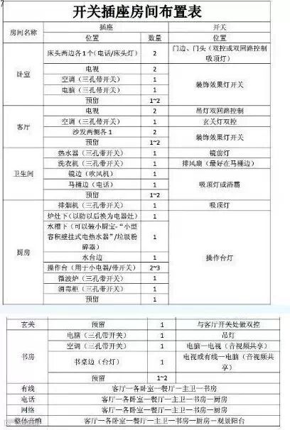 厨房至少十个插座,少了你哭。所有水龙头均配置冷热水管,至少两个洗手池最好能有拖把池。洗衣机最好放南阳台!厨房开关放厨房门口,阳台开关放阳台门口,不要集成在一个开关座上。