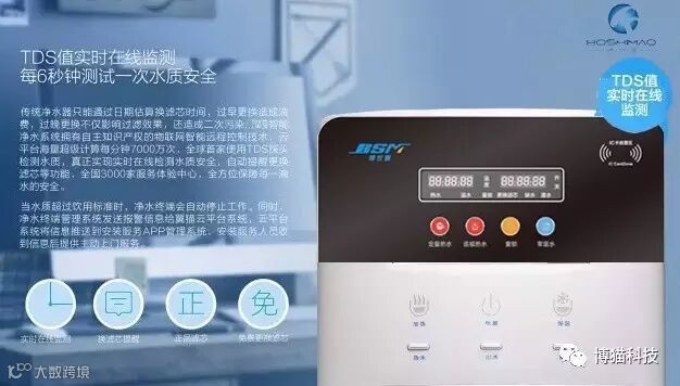 博猫科技智能净水系统采用了全球领先的RO反渗透精滤技术,并通过自主知识产权的远程物联网控制技术,实现了实时在线监测水质,实时在线控制出水,实时在线滤芯更换提醒,市场上几乎难以找到类似产品。拥有专利的实时在线监测,每6秒检测一次出水水质,彻底解决了传统净水行业的痛点,杜绝了净水设备的二次污染。相比于普通净水器,博猫科技智能净水系统拥有高尖端科技支持,造价方面同样高于市面上销售的大多数净水设备。