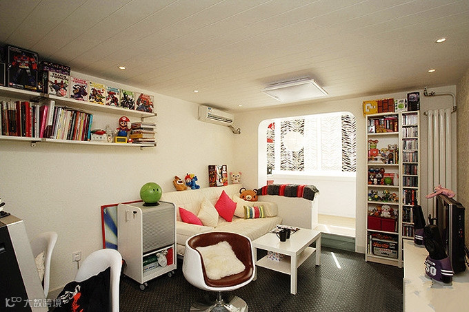 墙壁、沙发角落、茶几等地方,都做了收纳处理。不同色彩的书籍、玩具,还很好的装点了客厅,给客厅增加活力。
