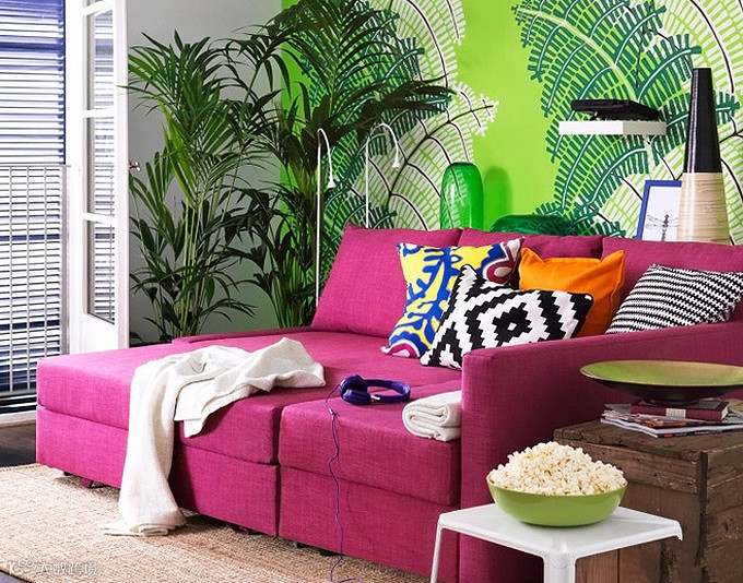 这款玫红色沙发摆放在客厅十分抢眼,背景墙是手绘的绿色植物,搭配沙发旁的绿色盆栽,栩栩如生。