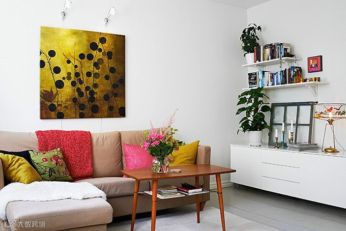 无论是墙壁的金色装饰画、沙发上的缤纷靠枕以及茶几上的艳丽鲜花,都是十分抢眼,让客厅舒适的同时还美艳万分。