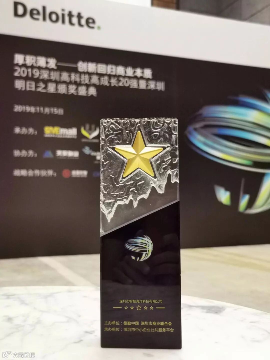 11月15日下午,深圳天安云谷举行了2019深圳高科技高成长20强暨深圳明日之星颁奖典礼。经过四个多月严格的选拔和评审,深圳市智慧海洋科技有限公司荣成功入选“2019深圳明日之星”榜单,副总裁俞知远作为公司代表上台领奖。