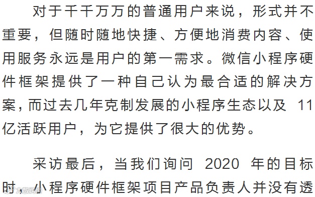 2020 年 1 月 9 日,在微信公开课 Pro 上,「微信小程序硬件框架」被正式发布。
