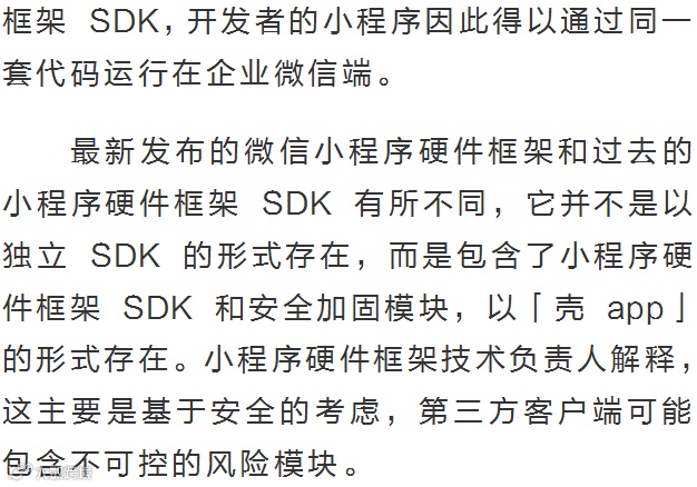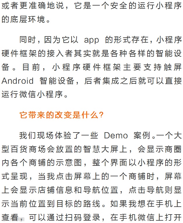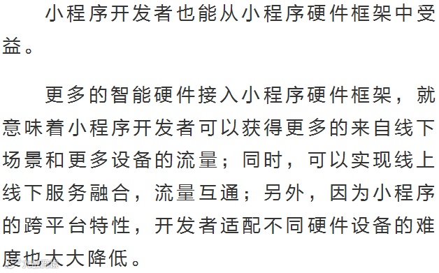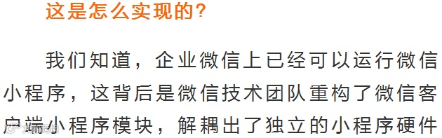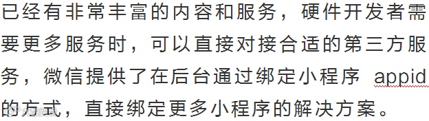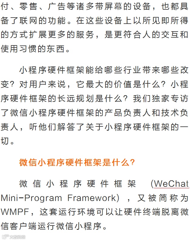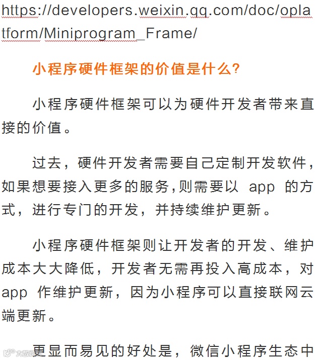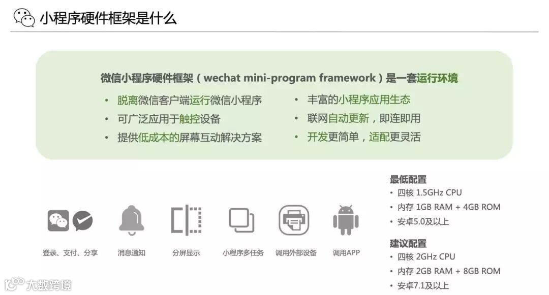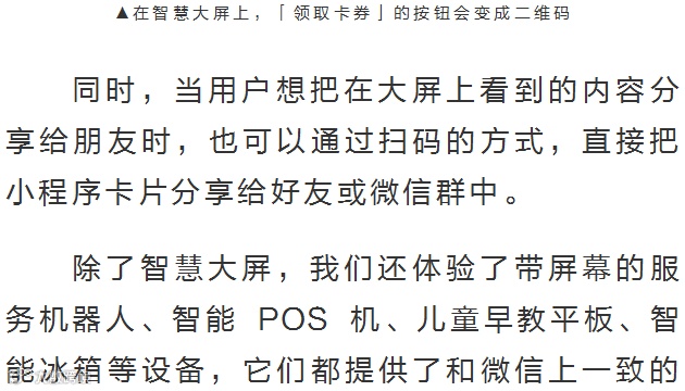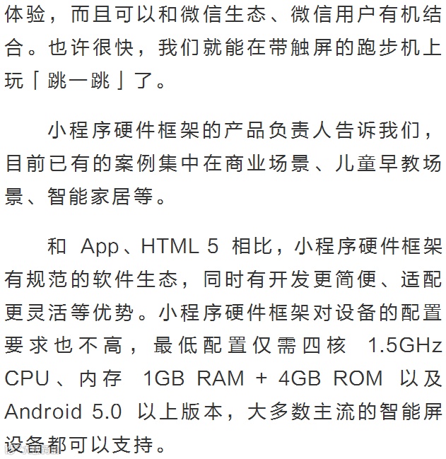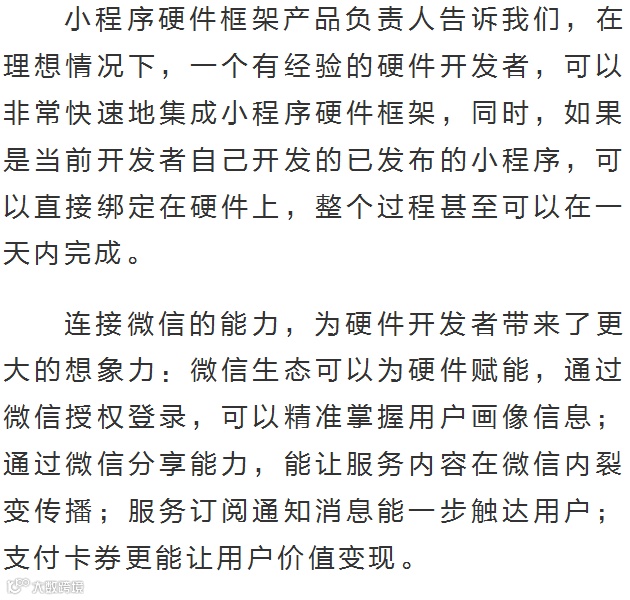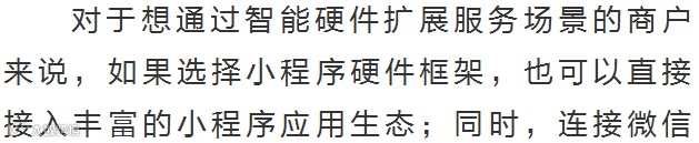 根据官方介绍,这是一套运行环境,能让硬件终端脱离微信客户端运行微信小程序。
