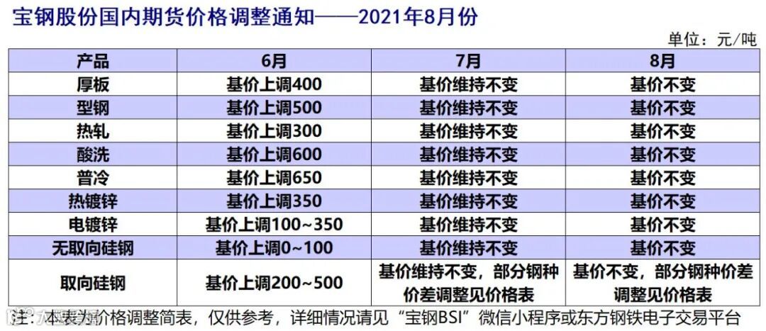 宝钢股份2021年8月价格发布