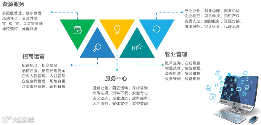 “智慧园区系统”通过整合云计算、物联网、大数据和人工智能等技术和各类资源,综合提升园区创新、服务管理能力、及产业升级,充分降低园区运营成本,提高园区工作效率,提升园区的软实力的智慧化系统。