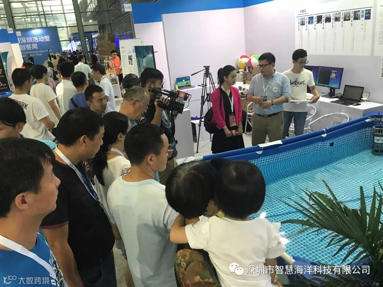 走近现场,人声鼎沸,各种新奇特的发明创作纷纷展现,各项活动举办得热火朝天。小编迫不及待赶往智慧海洋科技展区,发现前方公司的蓝色大水池已经被观众团团围住,简直人气爆棚。