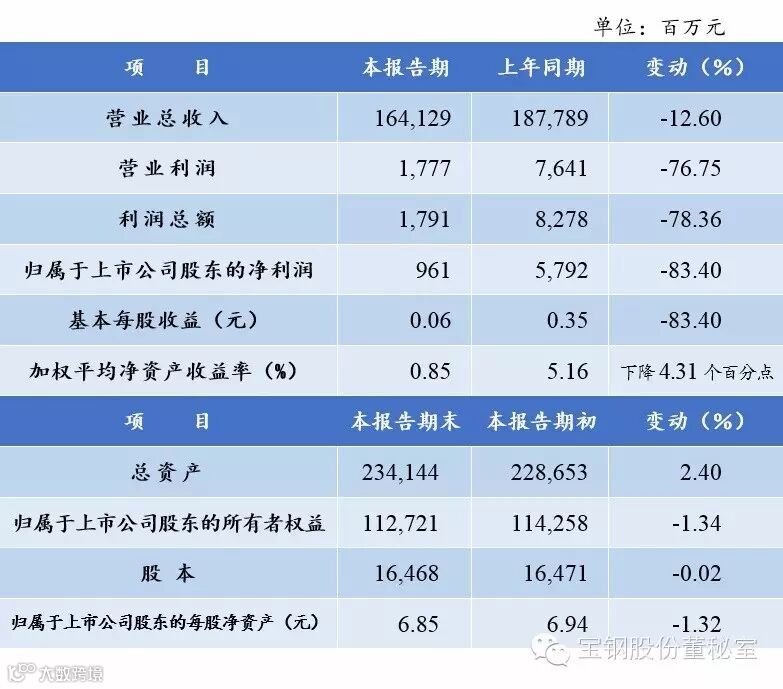 报告期内公司营业利润、利润总额及归属于上市公司股东的净利润同比分别下降77%、78%、83%,主要是受下游行业需求持续低迷,钢铁产品购销价差空间急剧收窄,年中人民币汇率大幅贬值公司主动切换美元短期融资,计提部分资产减值准备,以及非经营性贡献同比减少等因素影响。