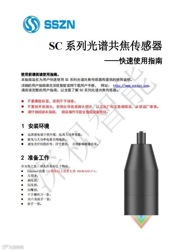 SC系列光谱共焦传感器快速使用指南旨在协助用户更加全面地了解深视智能SC系列的点光谱产品。为方便后续使用,您可在文末点击左下角阅读原文,以登陆深视智能官方网站注册下载更多资料。