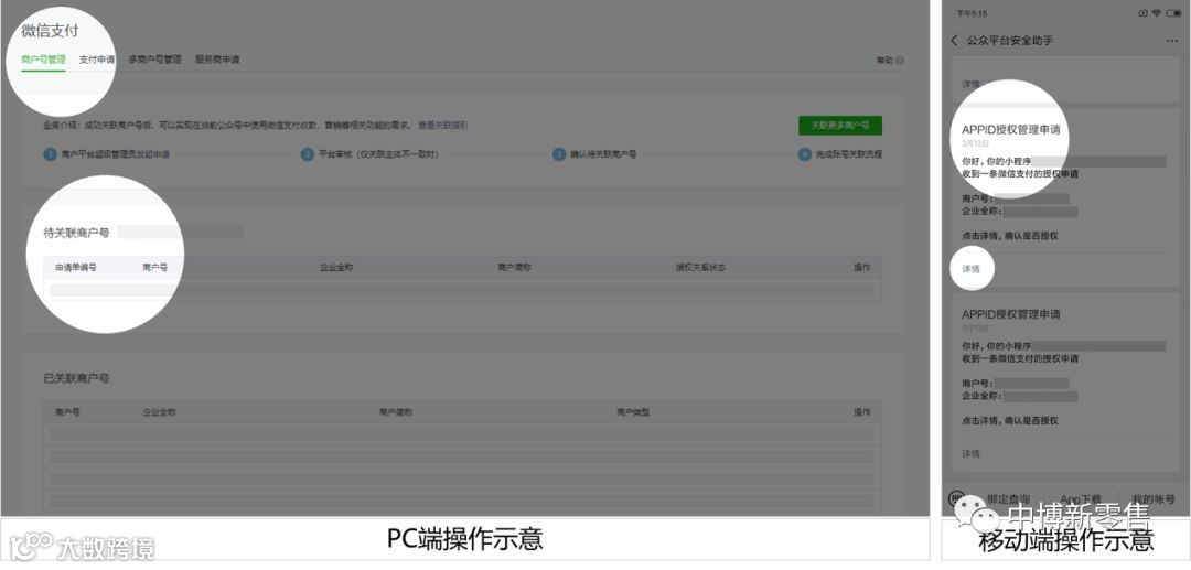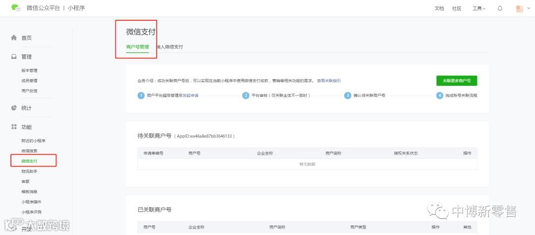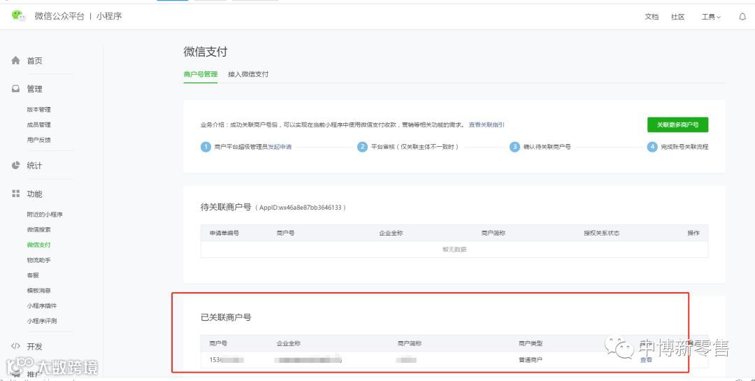 小程序:前往公众平台(mp.weixin.qq.com),点击“微信支付-商户号管理”,查看相关商户号信息,确认授权申请,或在“公众平台安全助手”下发的模板消息中确认授权信息;
