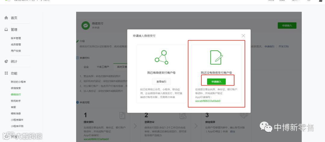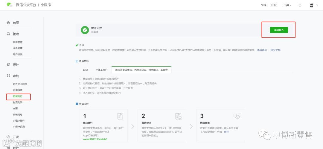 1、登录小程序公众号平台后,左侧微信支付,申请接入
