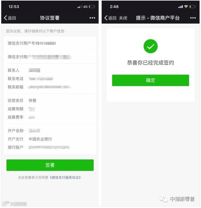 2、点击消息进入签约页面,核对商户信息和阅读协议后,点击签署,即可完成签约。