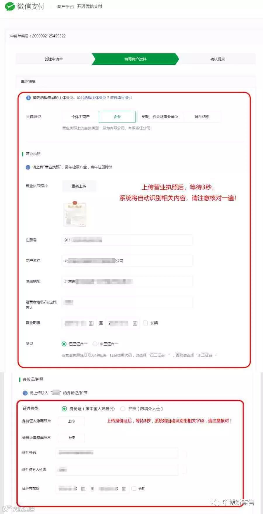 5、进入填写商户资料页面,选择主体类型为“企业”后,按页面提示提交相关信息,详见下图: