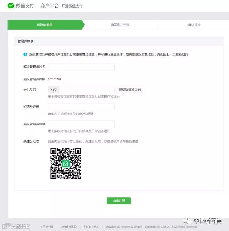 4、填写姓名、手机号、邮箱,以创建申请单,并微信扫码关注公众号,点击申请