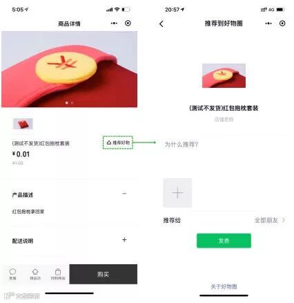 “好物圈”是微信推出的基于社交关系的好物推荐“圈子”,微信好物推荐接口能力的发布,让开发者可以便利的方式,将自己的小程序、公众号H5和“圈子”进行连接,让用户一键推荐“好物”。