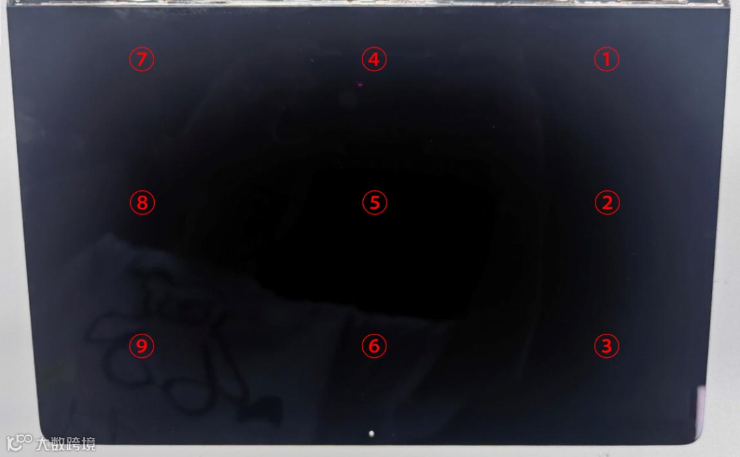 在屏幕面板上设定9个测量点位,并使用点激光SC10015记录点位数据的X、Y、Z值进行平面度计算。