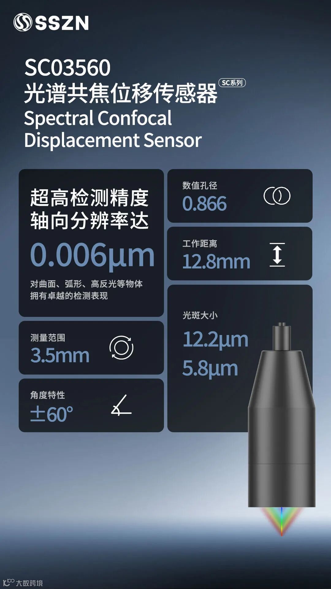 深视智能自主研发SC系列光谱共焦位移传感器拥有大角度回光,让弧面玻璃轮廓检测更加稳定,且传感器SC5001A配备了网口TCPIP(支持ModbusTCP)、串口RS232、模拟量输出、开关量输出等丰富的通讯供您选择,欢迎有需求的客户前来咨询选购。