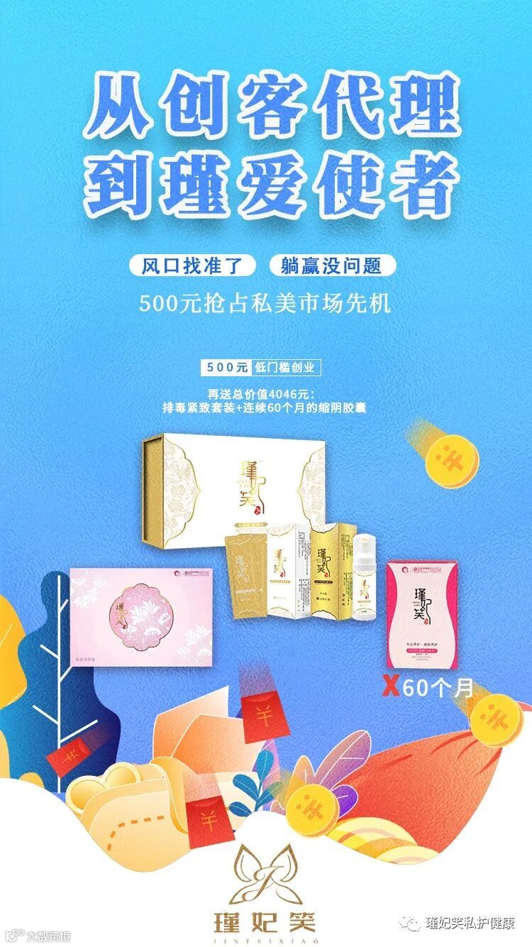 瑾妃笑私护健康,现面向全国招收创业者、代理人!低门槛,高收益!想创业,选对平台很重要,选对愿意扶持创业者、实现共同富裕的平台!更是重中之重!