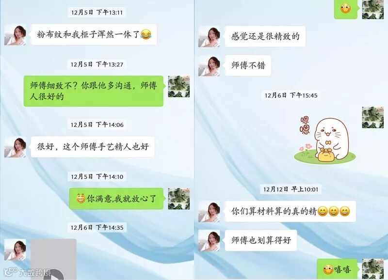 周女士说,自己在交了定金后,品牌经理会根据其他装修工序的进度来安排量房、出设计图、发货、安装等所有节点的工作,她确认了设计图后,自己基本上就不要管事了,所有的进度和安排,销售经理都会及时向她反馈,这样一条龙省心又满意的服务,她说自己都有点意想不到。