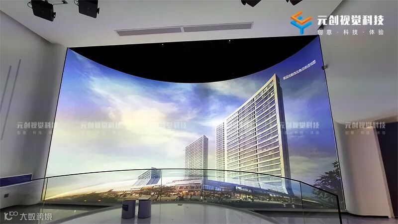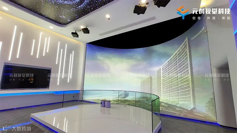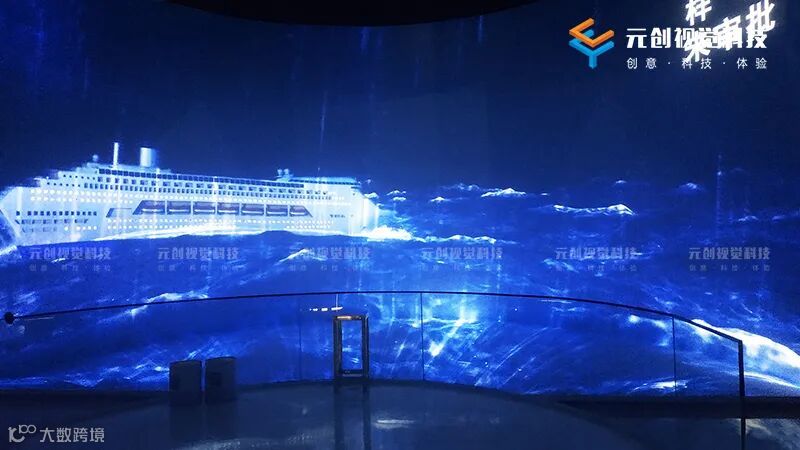 沉浸式弧幕空间由沉浸式弧幕+地幕+实景船舵+影片内容四大部分组成。沉浸式弧幕弧长:12.3m,高:4.8m,共采用了6台高清投影设备。结合元创设计创作的沉浸式弧幕影片内容,共同打造极具沉浸氛围的观影空间,此外,沉浸式弧幕空间还有风的环境特效,给人身临其境的感受,令人印象深刻。