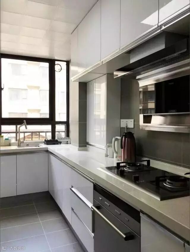 黑白两种颜色同样是厨房的主旋律。白色的橱柜面板配以不锈钢内凹的把手凸显厨房的现代感。