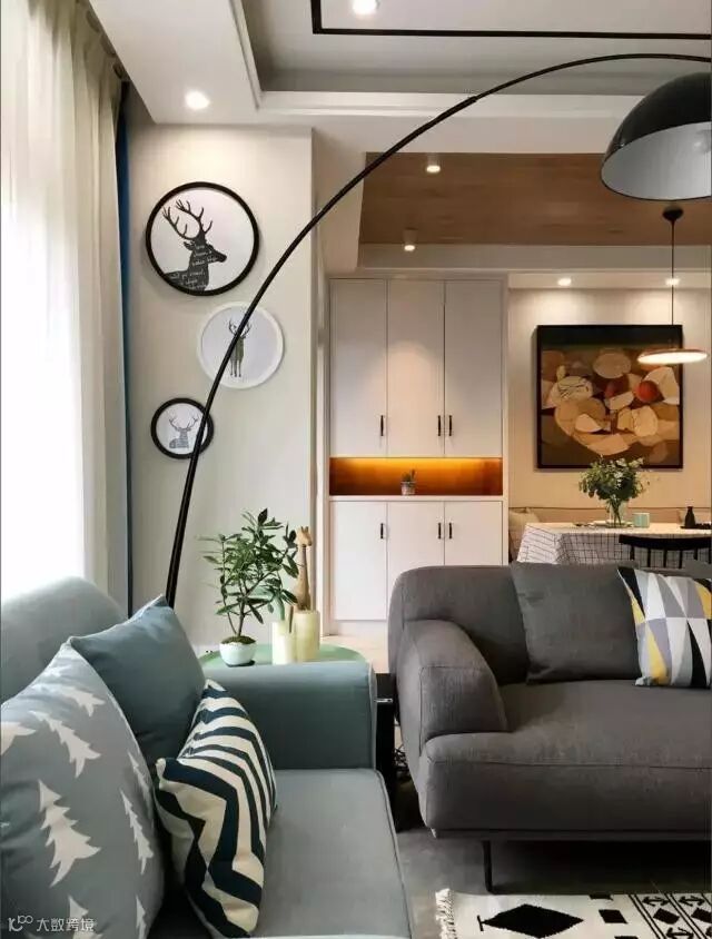挂壁装饰画犹如一朵朵云彩,悬浮于洁白的墙面之间,抱枕简约的图案给人带来视觉上的轻松感,生活也随之变得色彩斑斓。
