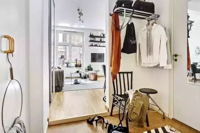在玄关站着就可以看到屋内几乎都是由白色、黑色和原木色组成的。用简单的置物架充当衣帽架,回到家随手将包包和衣服挂起来,再也不会乱扔。左手边一个大大的衣柜用来装所有的衣物。