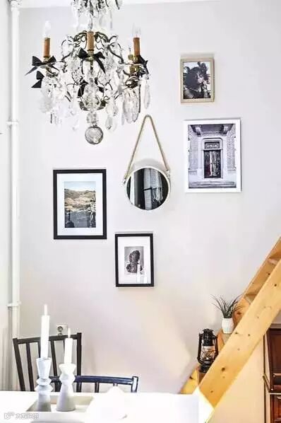 楼梯的墙壁上挂了各式各样的装饰物,让白色的墙壁看起来不单调。还有和简洁时尚相比有点浮夸华丽的吊灯。