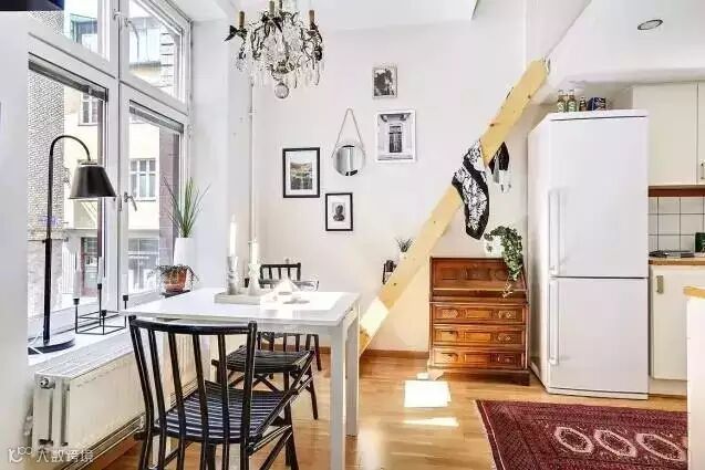 厨房和餐厅连成一体,使空间显得更大。通往卧室的楼梯下也没有浪费,放置了一个斗柜进行收纳。