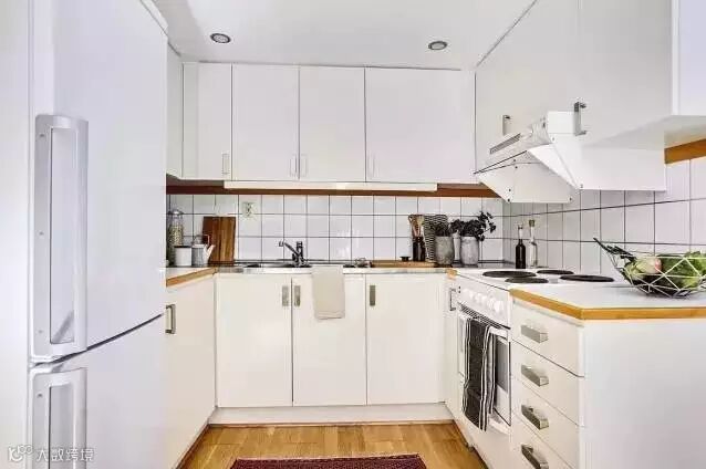 厨房是半开放式的,比起完全开放的厨房来说能更好的阻挡油烟。白色的厨柜和橘色的地板,让厨房看起来更加干净温暖。