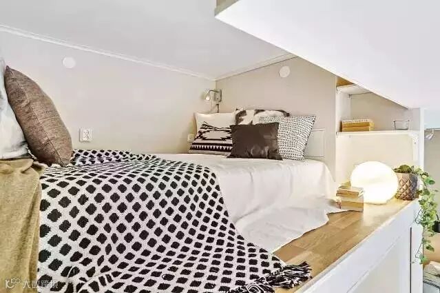 厨房正上方是睡觉的地方,做了一个阁楼的样子隔开。一边凹下去的隔断上,安了置物架,节省空间。墙角的小夜灯方便实用,地板上的圆形灯营造了卧室舒适的氛围,同时也不忘摆上一盆绿植进行点缀。