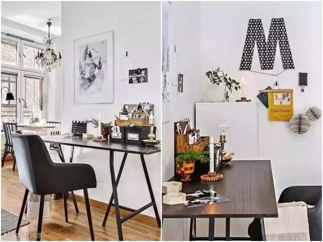 客厅的小角落设置了一个工作区域。简洁的桌椅使用起来更为方便,大大小小的装饰虽然很多,但是却看着舒心。一个字母M的装饰物吸引人的眼球。