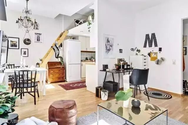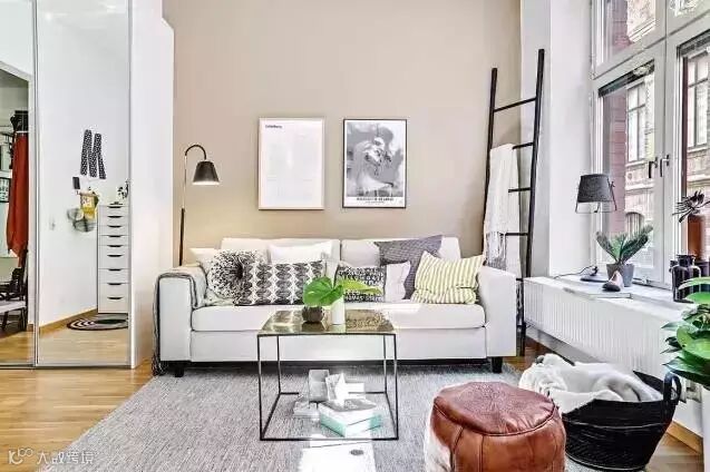 客厅内,米色的墙壁搭配白色的沙发,色彩和谐。富有设计感的茶几、两幅装饰画、还有一个梯子充当衣帽架,真的太别致了!