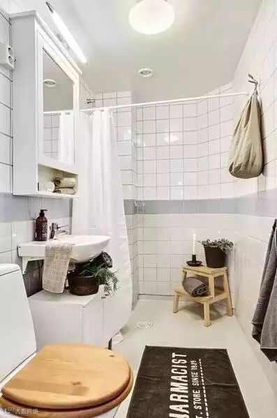 玄关右手边的浴室也是以白色为主。白色的瓷砖和白色柜橱搭配白色的灯光,浴室看起来明亮且不拥挤。放上几盆绿植,净化空气。