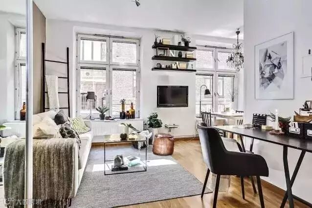 虽然装饰物很多,但是看起来却没有一点杂乱感。沙发旁边的柜子用来放衣物和一些杂物,柜门设计成两面大镜子,每天打扮完照一下,美美的出门~