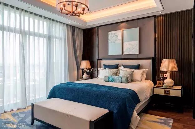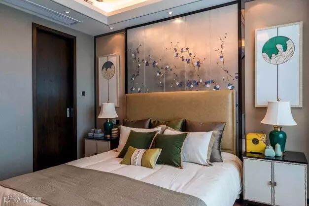 主卧独具特色的梅花屏风背景墙,尽显新中式的古典美。