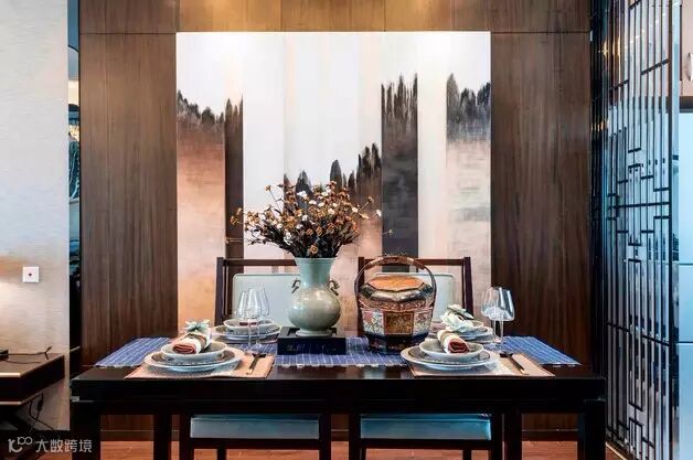水墨韵味十足的山水画餐厅背景墙增加了古典气息。