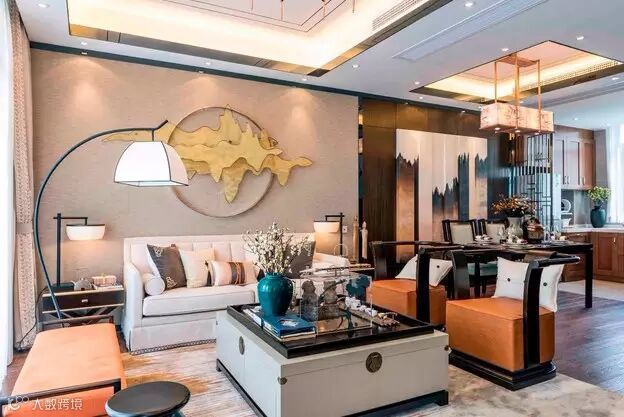 浅灰色客厅沙发与地板,搭配复古吊灯,中庸、雅致。橙红色座椅与偏欧式的蓝色花瓶点缀,则让客厅更显轻盈、有趣。