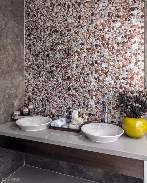卫生间大小不一石块拼接感的墙面壁画给人以草间弥生的感觉,凸显新中式风自然、返璞归真的的情趣美。