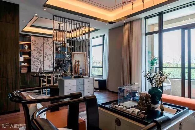 书房与客厅由一面镂空隔断隔开,增加了空间通透感。书桌上独具中国古代文化气息的文房四宝,折射出屋主的气质。