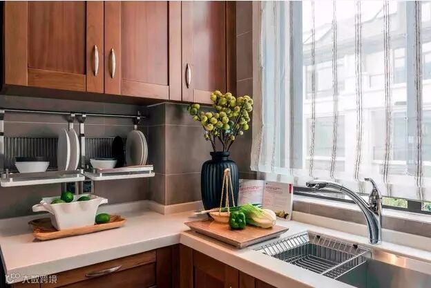 厨房镂空推拉门既区分了空间,又有很好的装饰作用。蓝色花瓶绿植增添生机。