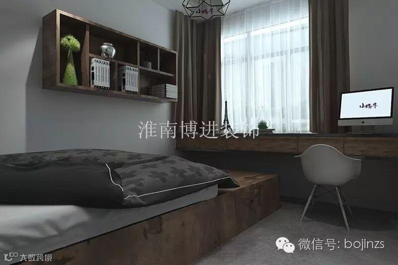 设计师在造型上走硬朗路线,面与面的结合,线与线的结合和点与点的结合,把整个轮廓勾勒出来,使空间非常立体,搭配以旧木色简单书架、旧木色榻榻米、白色的窗纱,既延续了整个的线条美和硬朗风格,又增加了一份柔软的感觉,使这个小角落变成一个非常独立、私人的空间。