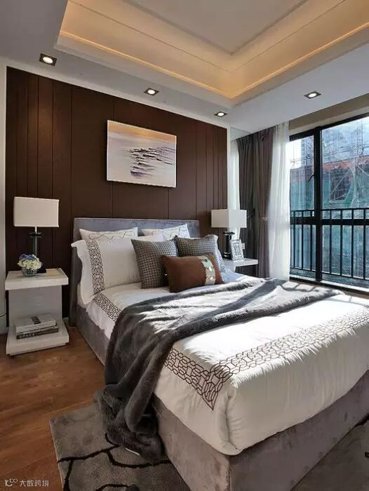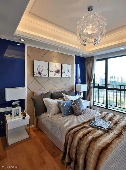 主卧很漂亮,设计师设计的床头背景很大气。中间做的软包,两边的做的蓝色玻璃通透大气。卧室的大窗户采光是非常好的。