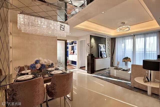 餐厅的空间有点小,设计师细心的把墙面的菱形镜面直接上顶的,通透感让整个空间看起来更大。