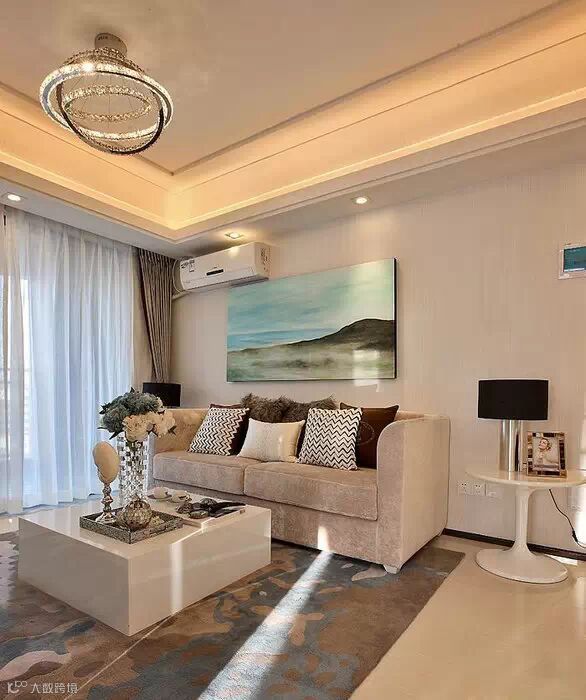 沙发这面墙面贴的是竖条的墙纸,简单的米白色,直接挂一副画,充满意境。