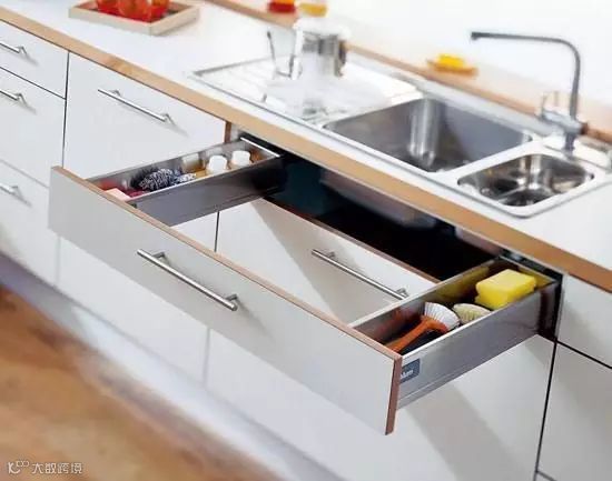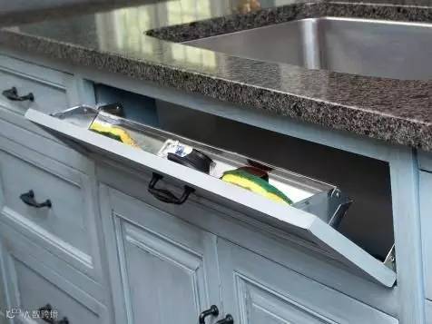 很多人觉得水槽不便于收纳,其实不然。像下图这样在洗碗槽边上做个小小的拉柜,装两个凹槽用来放洗碗布、海绵等洗涤用品,美观又便利。