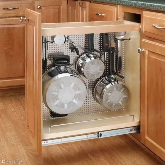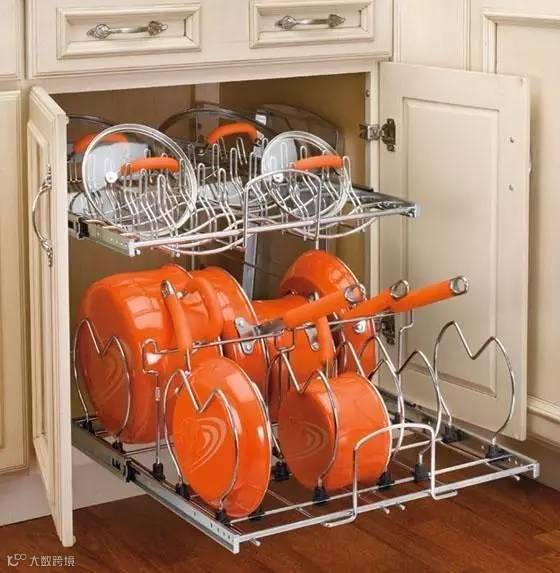 灶台底下安一个抽拉式的置物架,拉取方便~